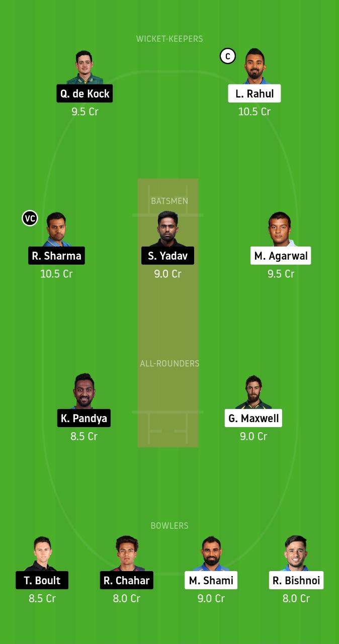 Quinton de Kock, KL Rahul (c), Mayank Agarwal, Rohit Sharma (vc), Suryakumar Yadav, Krunal Pandya, Glenn Maxwell, Mohammed Shami, Trent Boult, Ravi Bishnoi, and Rahul Chahar