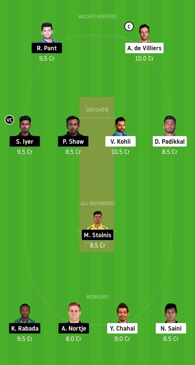 Rishabh Pant, AB de Villiers (c), Devdutt Padikkal, Shreyas Iyer (vc), Virat Kohli, Prithvi Shaw, Marcus Stoinis, Kagiso Rabada, Yuzvendra Chahal, Anrich Nortje, and Navdeep Saini.