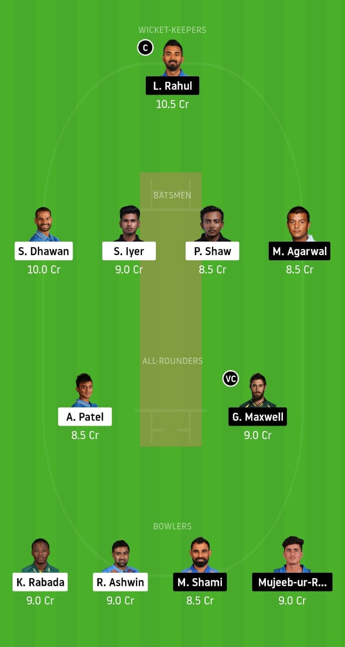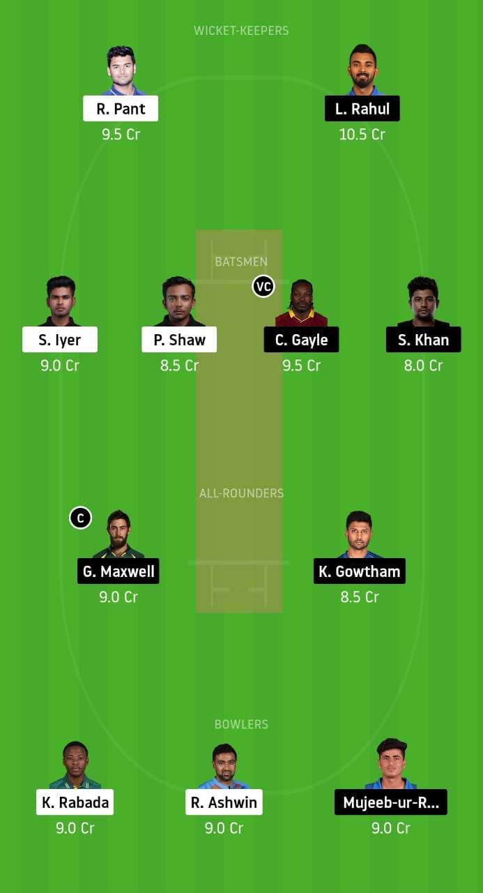 KL Rahul, Rishabh Pant, Shreyas Iyer, Prithvi Shaw, Chris Gayle (vc), Sarfaraz Khan, Glenn Maxwell (c), Krishnappa Gowtham, Kagiso Rabada, Ravichandran Ashwin, and Mujeeb-ur-Rehman