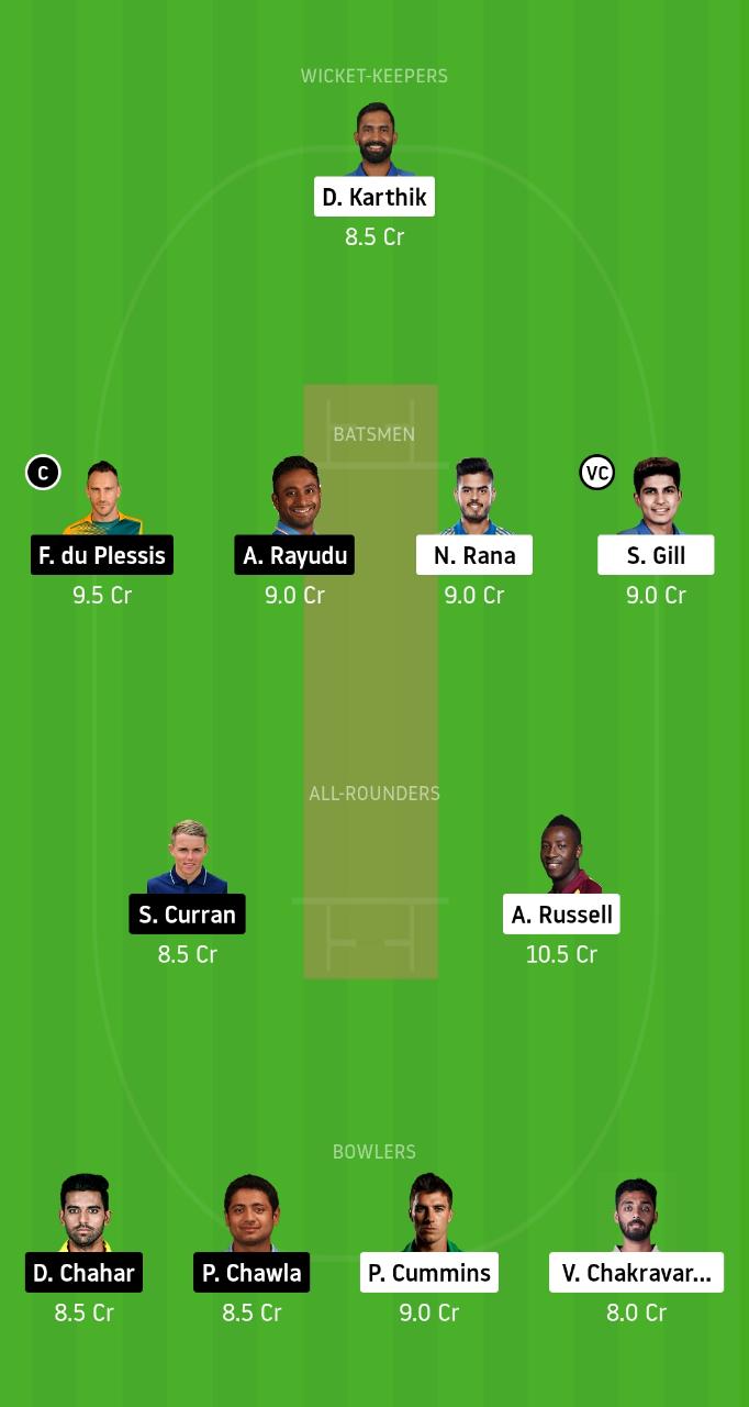 Dinesh Karthik, Faf du Plessis (c), Ambati Rayudu, Nitish Rana, Shubman Gill (vc), Andre Russell, Sam Curran, Deepak Chahar, Piyush Chawla, Pat Cummins, and Varun Chakravarthy