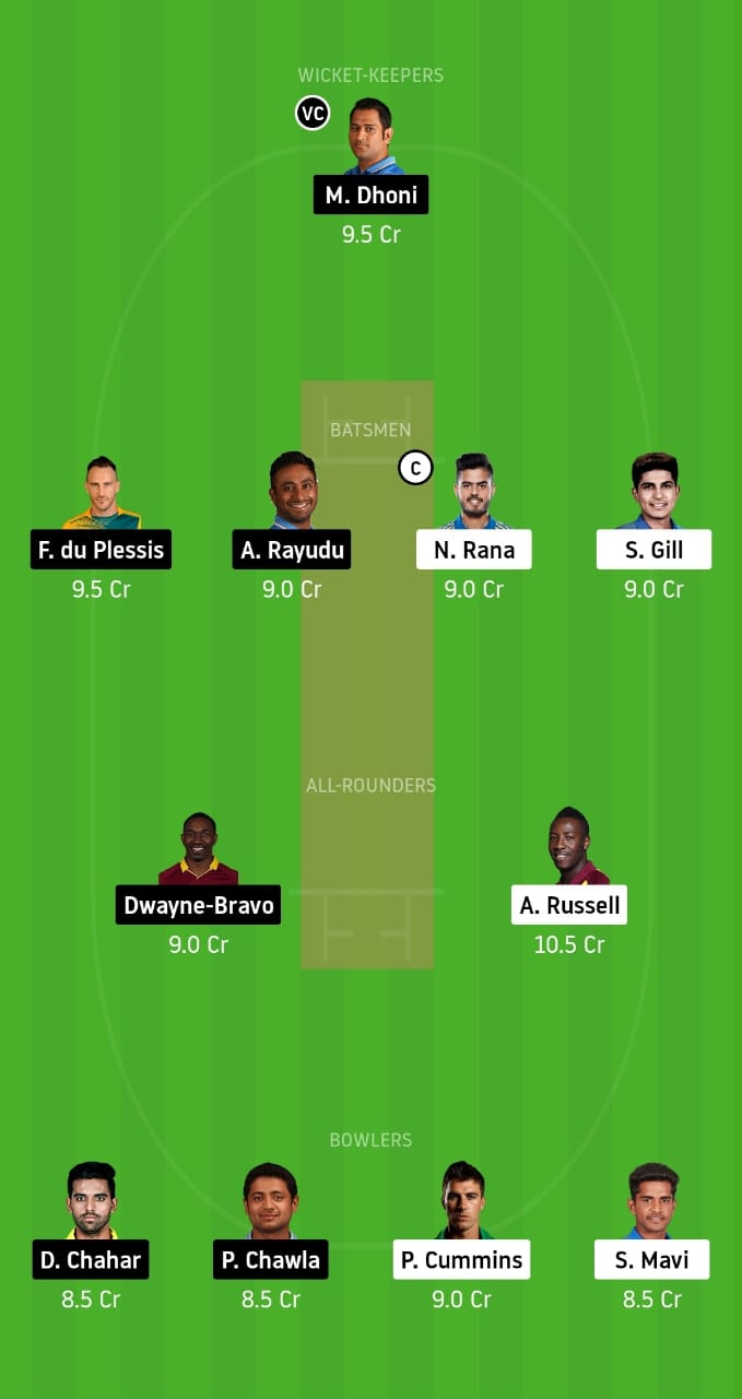 MS Dhoni (vc), Faf du Plessis, Ambati Rayudu, Nitish Rana (c), Shubman Gill, Andre Russell, Dwayne Bravo, Deepak Chahar, Piyush Chawla, Pat Cummins and Shivam Mavi