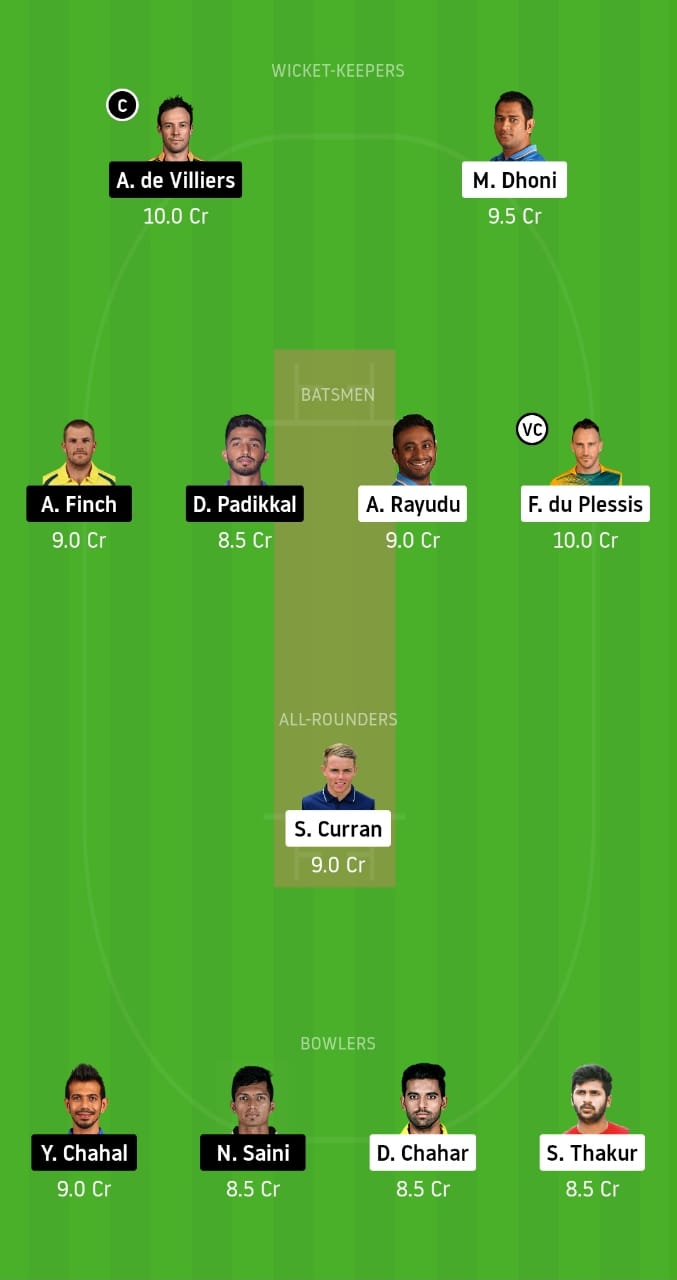 MS Dhoni, AB de Villiers, Faf du Plessis, Devdutt Padikkal, Aaron Finch, Ambati Rayudu, Sam Curran, Yuzvendra Chahal, Navdeep Saini, Shardul Thakur, and Deepak Chahar