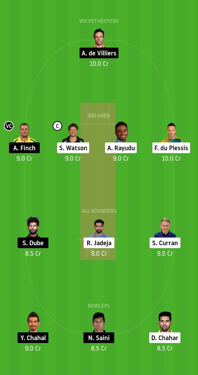 Shane Watson, AB de Villiers, Faf du Plessis, Shivam Dube, Aaron Finch, Ambati Rayudu, Sam Curran, Yuzvendra Chahal, Navdeep Saini, Ravindra Jadeja and Deepak Chahar