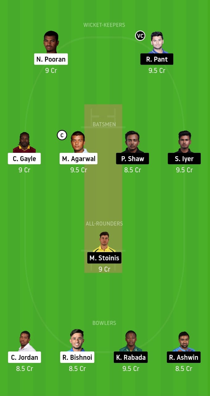 Nicholas Pooran, Rishabh Pant, Chris Gayle, Mayank Agarwal, Prithvi Shaw, Shreyas Iyer, Marcus Stoinis, Chris Jordan, Ravi Bishnoi, Kagiso Rabada, and Ravi Ashwin