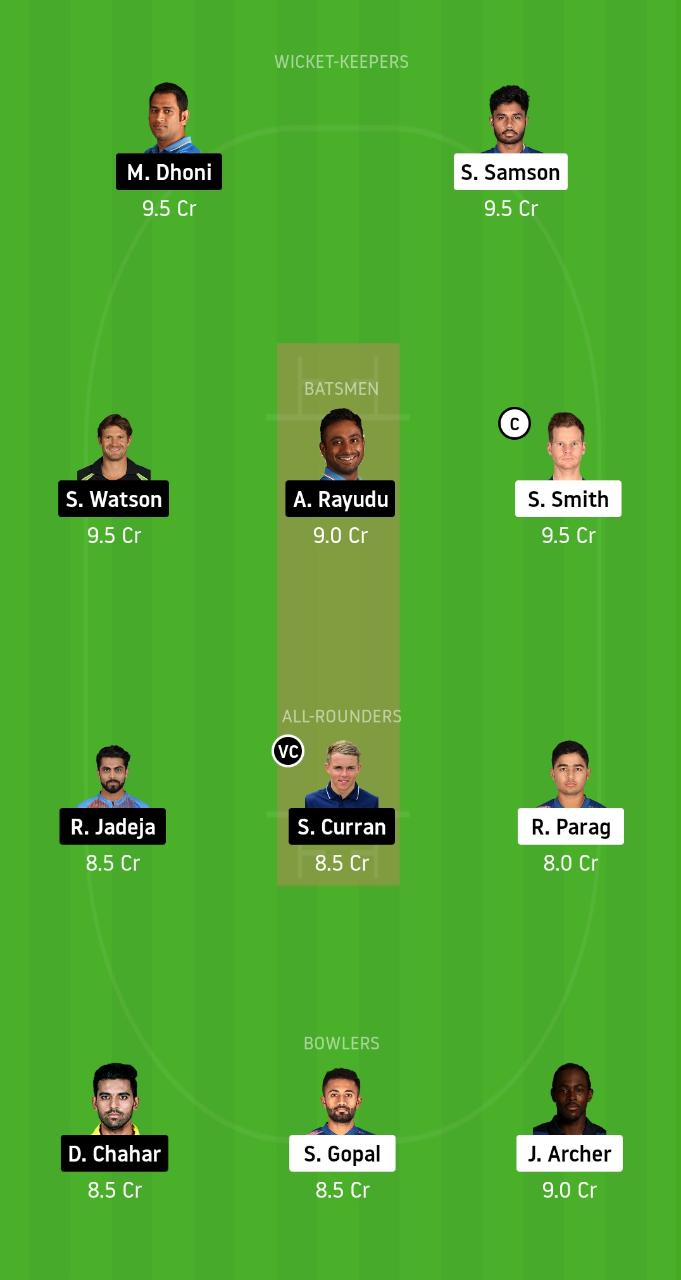 MS Dhoni, Sanju Samson, Ambati Rayudu, Shane Watson, Steve Smith (c), Sam Curran (vc), Ravindra Jadeja, Riyan Parag, Deepak Chahar, Jofra Archer, and Shreyas Gopal