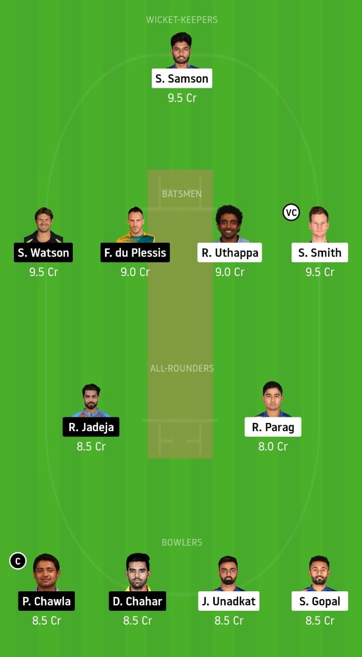 Sanju Samson, Robin Uthappa, Faf du Plessis, Shane Watson, Steve Smith (vc), Piyush Chawla (c), Ravindra Jadeja, Riyan Parag, Deepak Chahar, Jaydev Unadkat, and Shreyas Gopal