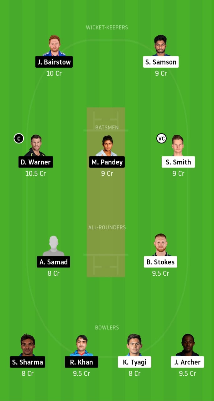 Jonny Bairstow, Manish Pandey, David Warner, Sanju Samson, Steve Smith, Abdul Samad, Ben Stokes, Jofra Archer, Rashid Khan, Kartik Tyagi, and Sandeep Sharma.