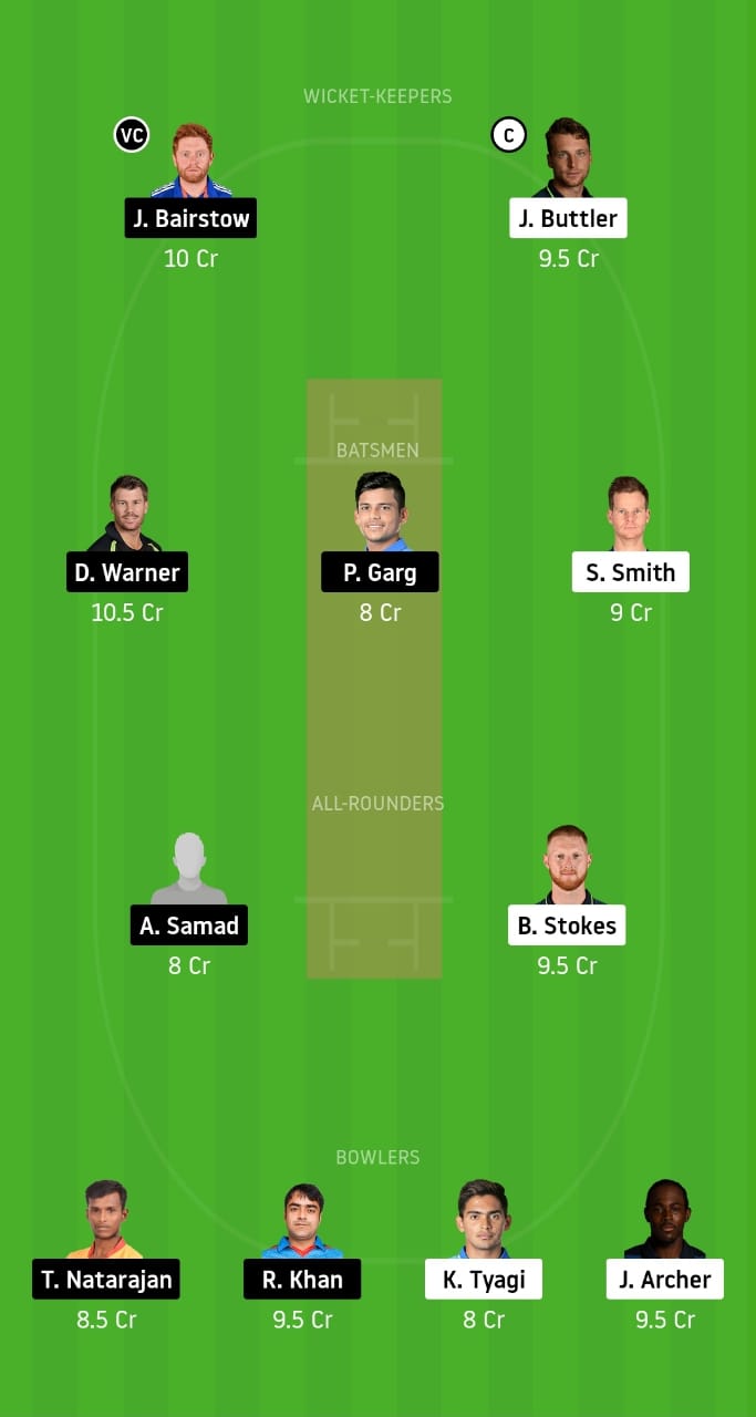 Jonny Bairstow, Priyam Garg, David Warner, Jos Buttler, Steve Smith, Abdul Samad, Ben Stokes, Jofra Archer, Rashid Khan, Kartik Tyagi, and T Natarajan.