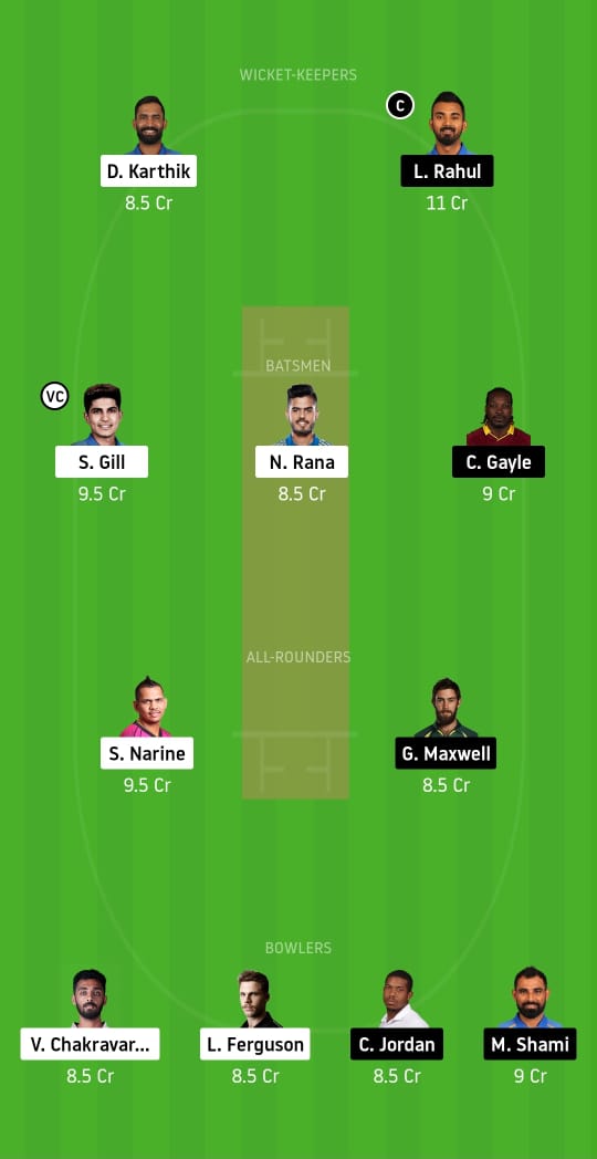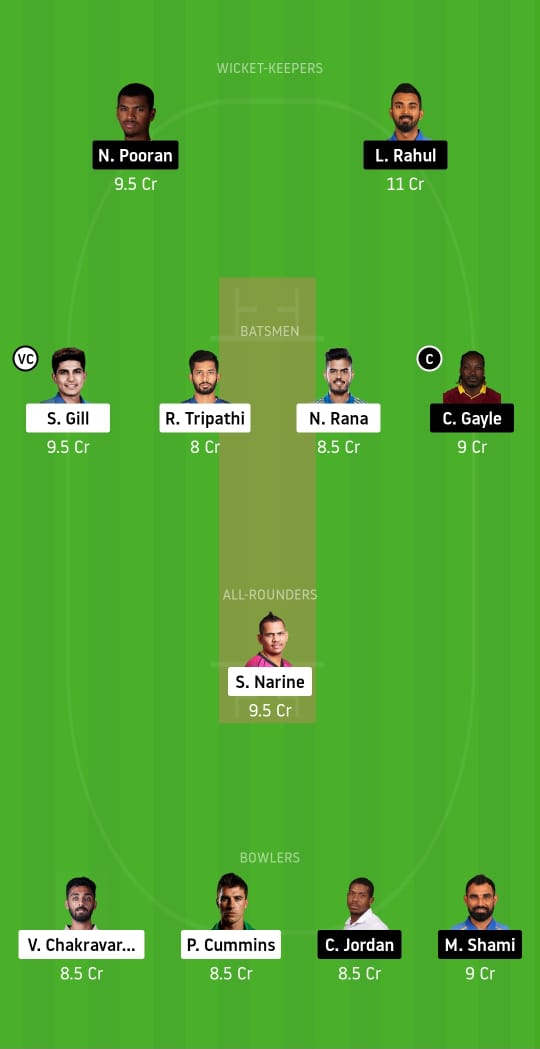 KL Rahul, Nicholas Pooran, Shubman Gill (vc), Nitish Rana, Chris Gayle (c), Sunil Narine, Rahul Tripathi, Mohammed Shami, Chris Jordan, Varun Chakravarthy, and Pat Cummins