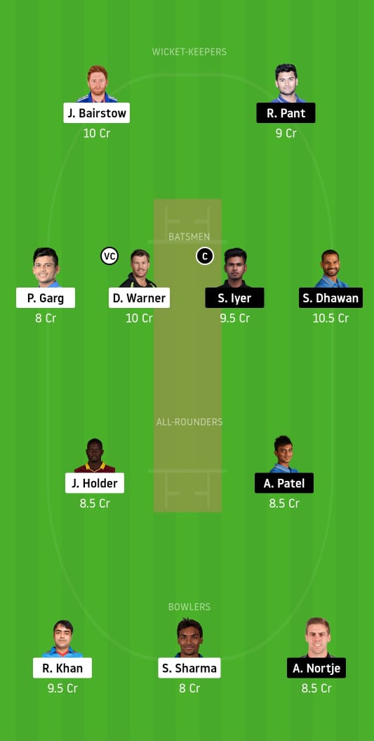 Jonny Bairstow, Rishabh Pant, Shikhar Dhawan, David Warner (vc), Shreyas Iyer (c), Priyam Garg, Axar Patel, Jason Holder, Sandeep Sharma, Rashid Khan, and Anrich Nortje