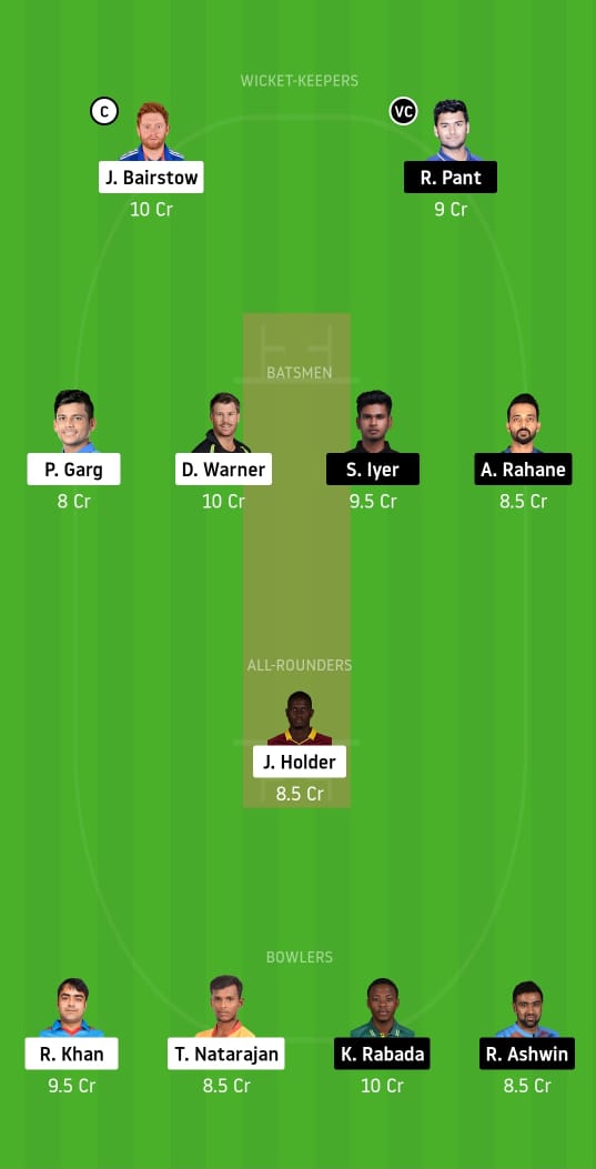 Jonny Bairstow (c), Rishabh Pant (vc), Ajinkya Rahane, David Warner, Shreyas Iyer, Priyam Garg, Kagiso Rabada, Jason Holder, T Natarajan, Rashid Khan, and Ravi Ashwin