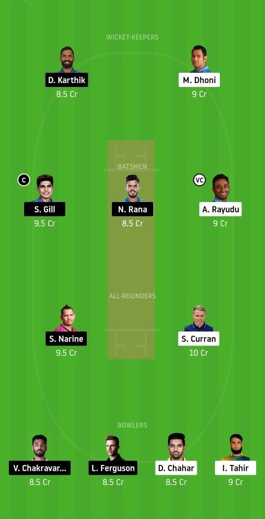 MS Dhoni, Dinesh Karthik, Shubman Gill (c), Ambati Rayudu (vc), Nitish Rana, Sam Curran, Sunil Narine, Varun Chakravarthy, Deepak Chahar, Imran Tahir, and Lockie Ferguson.