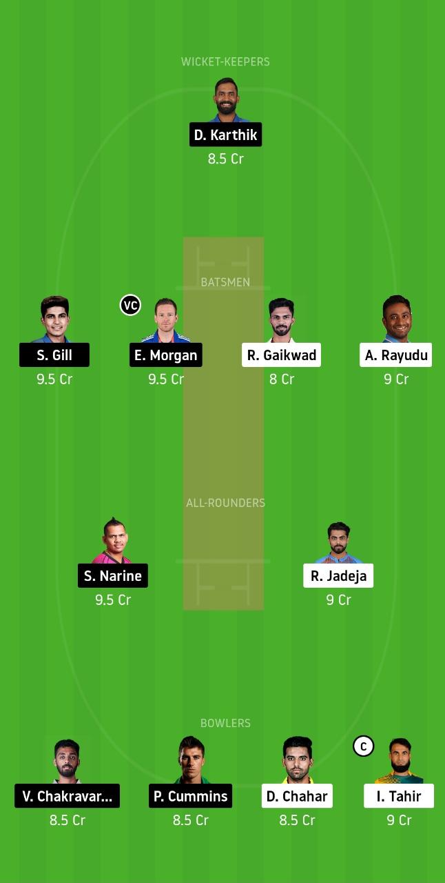 Ruturaj Gaikwad, Dinesh Karthik, Eoin Morgan (vc), Ambati Rayudu, Shubman Gill, Ravindra Jadeja, Sunil Narine, Varun Chakravarthy, Deepak Chahar, Imran Tahir (c), and Pat Cummins.