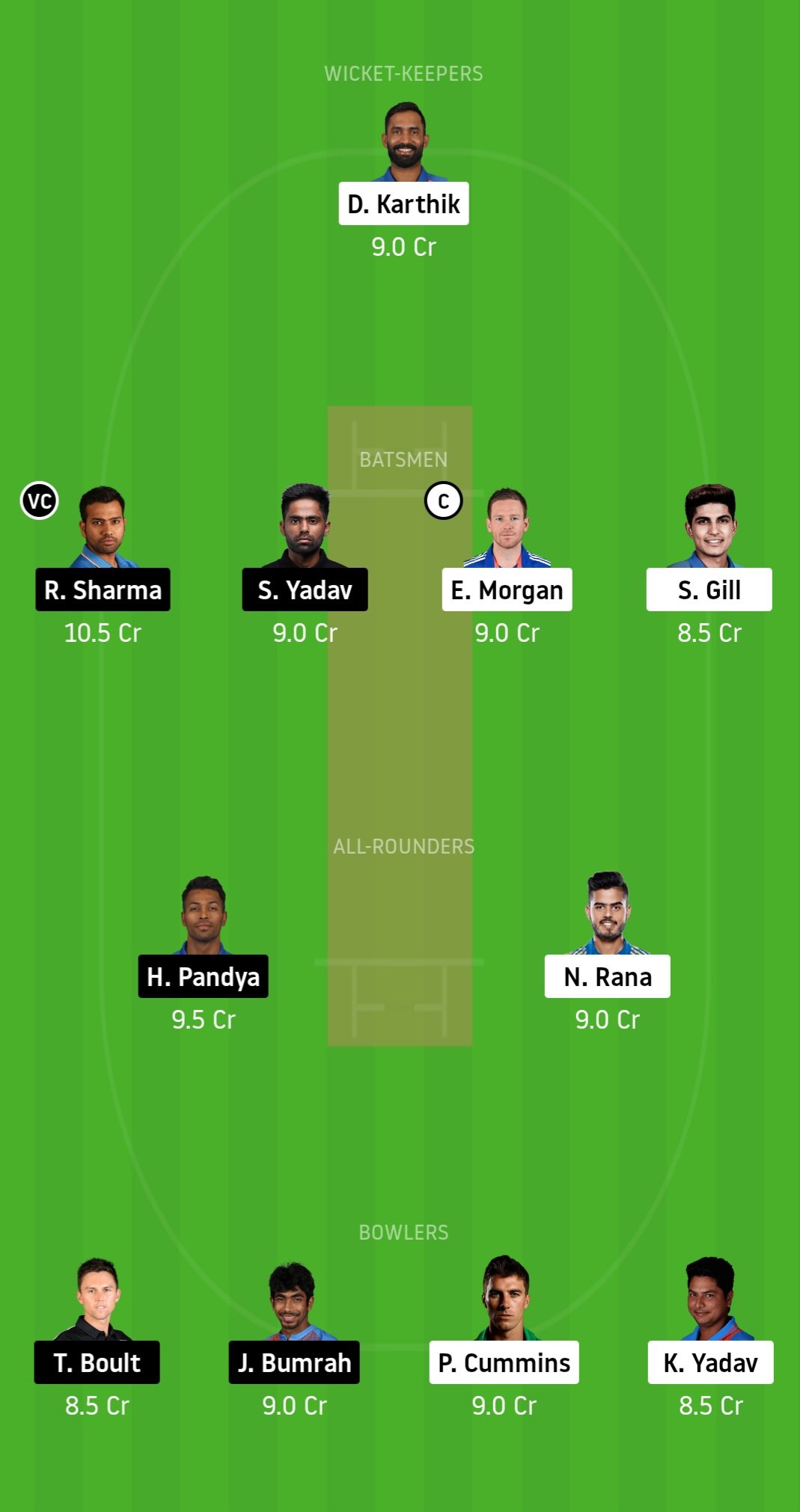 Dinesh Karthik, Rohit Sharma (vc), Suryakumar Yadav, Eoin Morgan (c), Shubman Gill, Hardik Pandya, Nitish Rana, Jasprit Bumrah, Pat Cummins, Trent Boult, and Kuldeep Yadav.