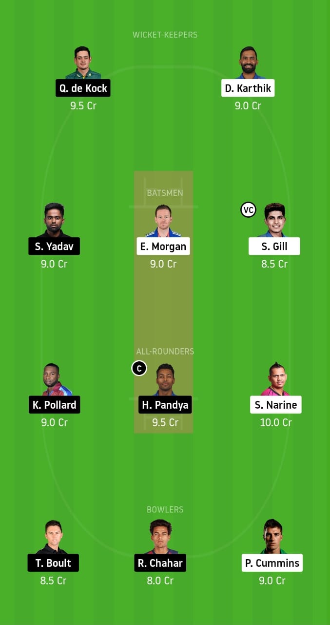 Dinesh Karthik, Quinton de Kock, Suryakumar Yadav, Eoin Morgan, Shubman Gill (vc), Sunil Narine, Hardik Pandya (c), Kieron Pollard, Trent Boult, Pat Cummins and Rahul Chahar.