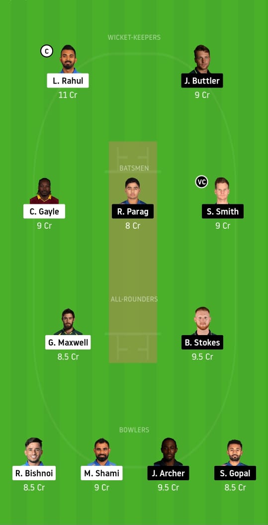 Lokesh Rahul (c), Jos Buttler, Chris Gayle, Riyan Parag, Steve Smith (vc), Glenn Maxwell, Ben Stokes, Ravi Bishnoi, Mohammed Shami, Jofra Archer, and Shreyas Gopal.