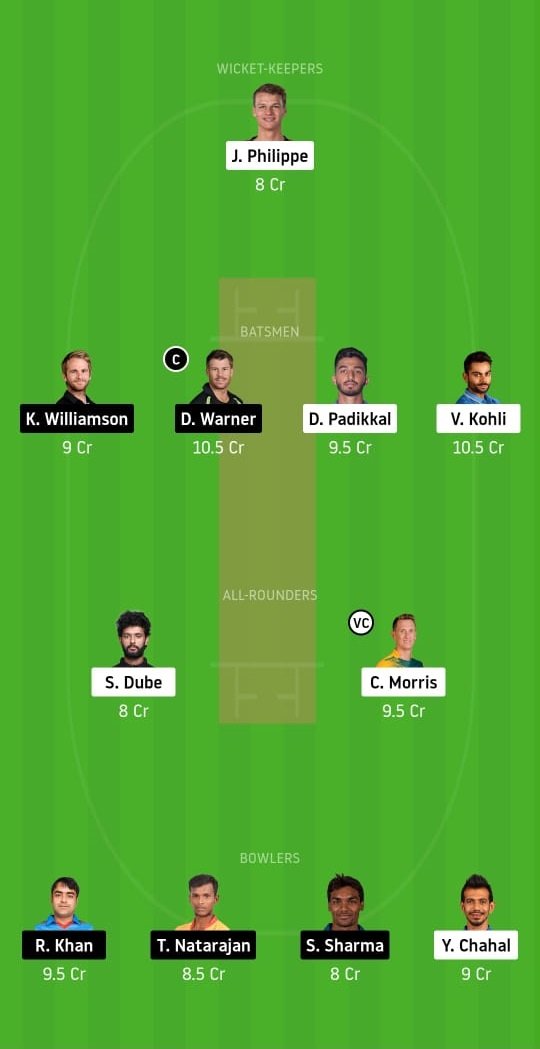 Josh Philippe, Devdutt Padikkal, Virat Kohli, David Warner (c), Kane Williamson, Shivam Dube, Chris Morris (vc), Rashid Khan, T Natarajan, Sandeep Sharma, and Yuzvendra Chahal.