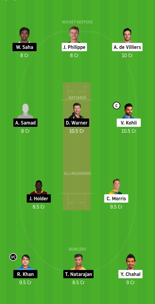Josh Philippe, AB de Villiers, Wriddhiman Saha, Virat Kohli (c), David Warner, Abdul Samad, Chris Morris, Jason Holder, Rashid Khan (vc), T Natarajan, and Yuzvendra Chahal.
