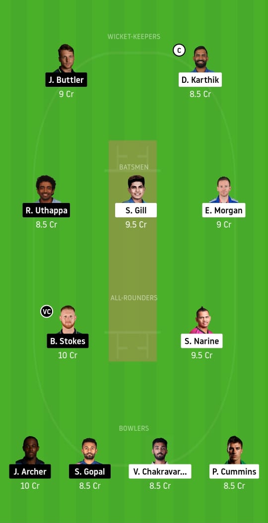 Jos Buttler, Dinesh Karthik (c), Shubman Gill, Eoin Morgan, Robin Uthappa, Ben Stokes (vc), Sunil Narine, Jofra Archer, Varun Chakravarthy, Pat Cummins, and Shreyas Gopal.