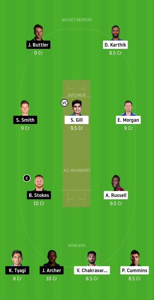 Jos Buttler, Dinesh Karthik, Shubman Gill (vc), Eoin Morgan, Steve Smith, Ben Stokes (c), Andre Russell, Jofra Archer, Varun Chakravarthy, Pat Cummins, and Kartik Tyagi.