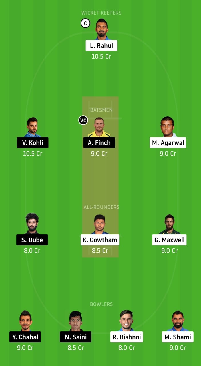 KL Rahul (c), Virat Kohli, Aaron Finch (vc), Mayank Agarwal, Shivam Dube, Krishnappa Gowtham, Glenn Maxwell, Mohammed Shami, Yuzvendra Chahal, Navdeep Saini, and Ravi Bishnoi