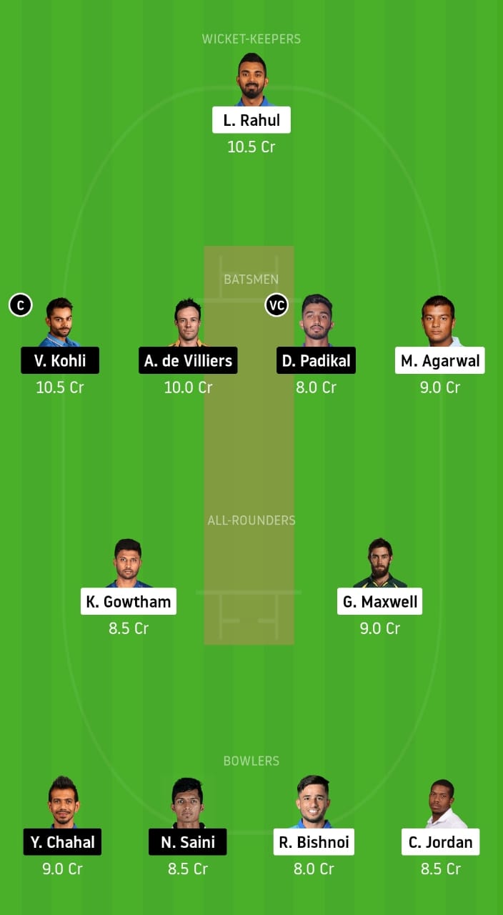 KL Rahul, Virat Kohli (c), AB de Villiers, Mayank Agarwal, Devdutt Padikkal (vc), Krishnappa Gowtham, Glenn Maxwell, Chris Jordan, Yuzvendra Chahal, Navdeep Saini, and Ravi Bishnoi