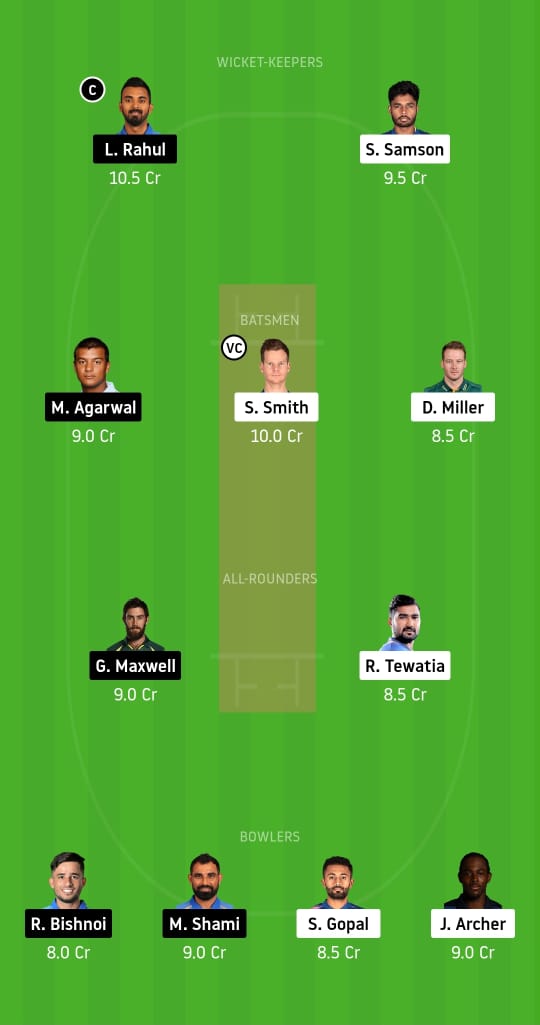 KL Rahul (C), Sanju Samson, Mayank Agarwal, Steve Smith (vc), David Miller, Glenn Maxwell, Rahul Tewatia, Ravi Bishnoi, Mohammed Shami, Shreyas Gopal, and Jofra Archer