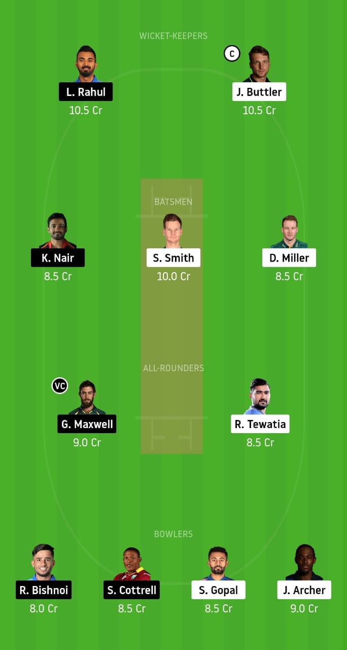 KL Rahul, Jos Buttler (c), Karun Nair, Steve Smith, David Miller, Glenn Maxwell (vc), Rahul Tewatia, Ravi Bishnoi, Sheldon Cottrell, Shreyas Gopal, and Jofra Archer
