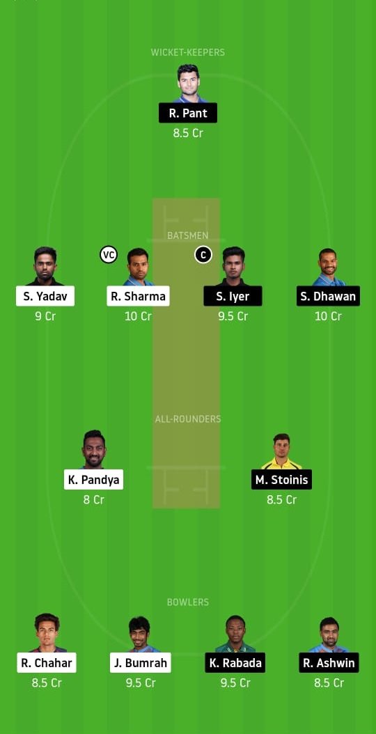 Rishabh Pant, Shreyas Iyer (c), Rohit Sharma (vc), Shikhar Dhawan, Suryakumar Yadav. Krunal Pandya, Marcus Stoinis, Kagiso Rabada, Rahul Chahar, Jasprit Bumrah, and Ravi Ashwin