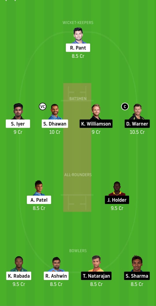Rishabh Pant, David Warner (c), Shikhar Dhawan, Shreyas Iyer (vc), Kane Williamson, Axar Patel, Jason Holder, Kagiso Rabada, T Natarajan, Ravi Ashwin, and Sandeep Sharma