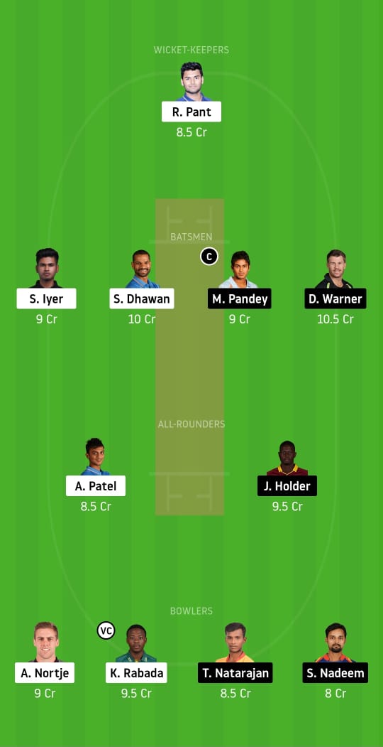 Rishabh Pant, David Warner, Shikhar Dhawan, Shreyas Iyer, Manish Pandey (c), Axar Patel, Jason Holder, Kagiso Rabada (vc), T Natarajan, Anrich Nortje, and Shahbaz Nadeem