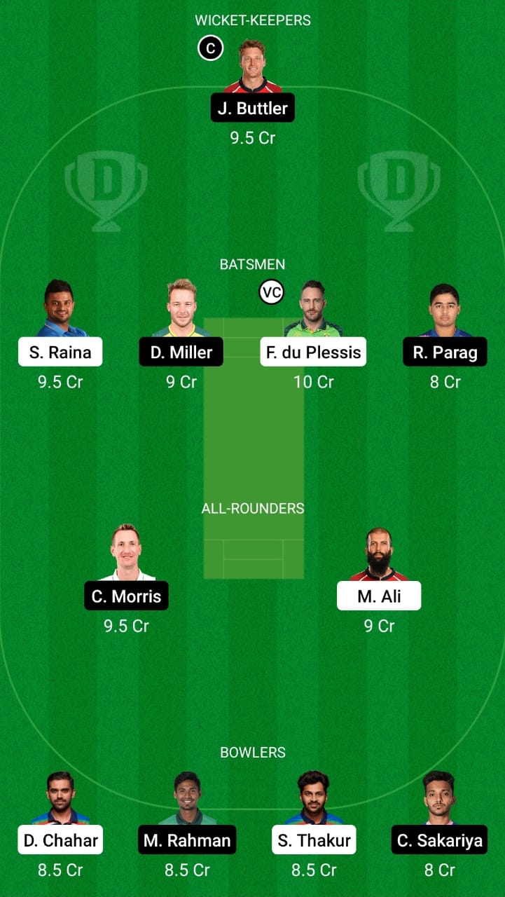 Jos Buttler (c), Suresh Raina, David Miller, Riyan Parag, Faf du Plessis (vc), Chris Morris, Moeen Ali, Deepak Chahar, Mustafizur Rahman, Shardul Thakur, and Chetan Sakariya