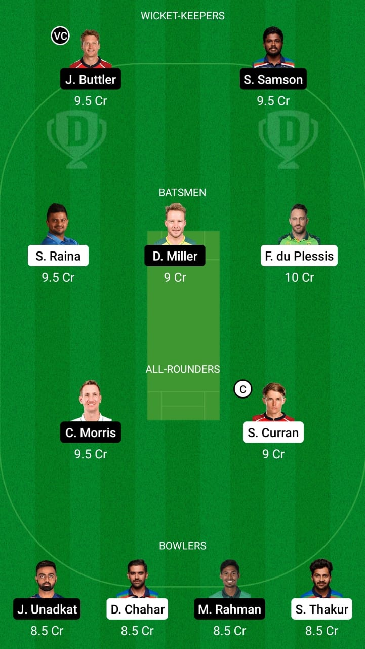 Jos Buttler (vc), Suresh Raina, David Miller, Sanju Samson, Faf du Plessis, Chris Morris, Sam Curran (c), Deepak Chahar, Mustafizur Rahman, Shardul Thakur, and Jaydev Unadkat