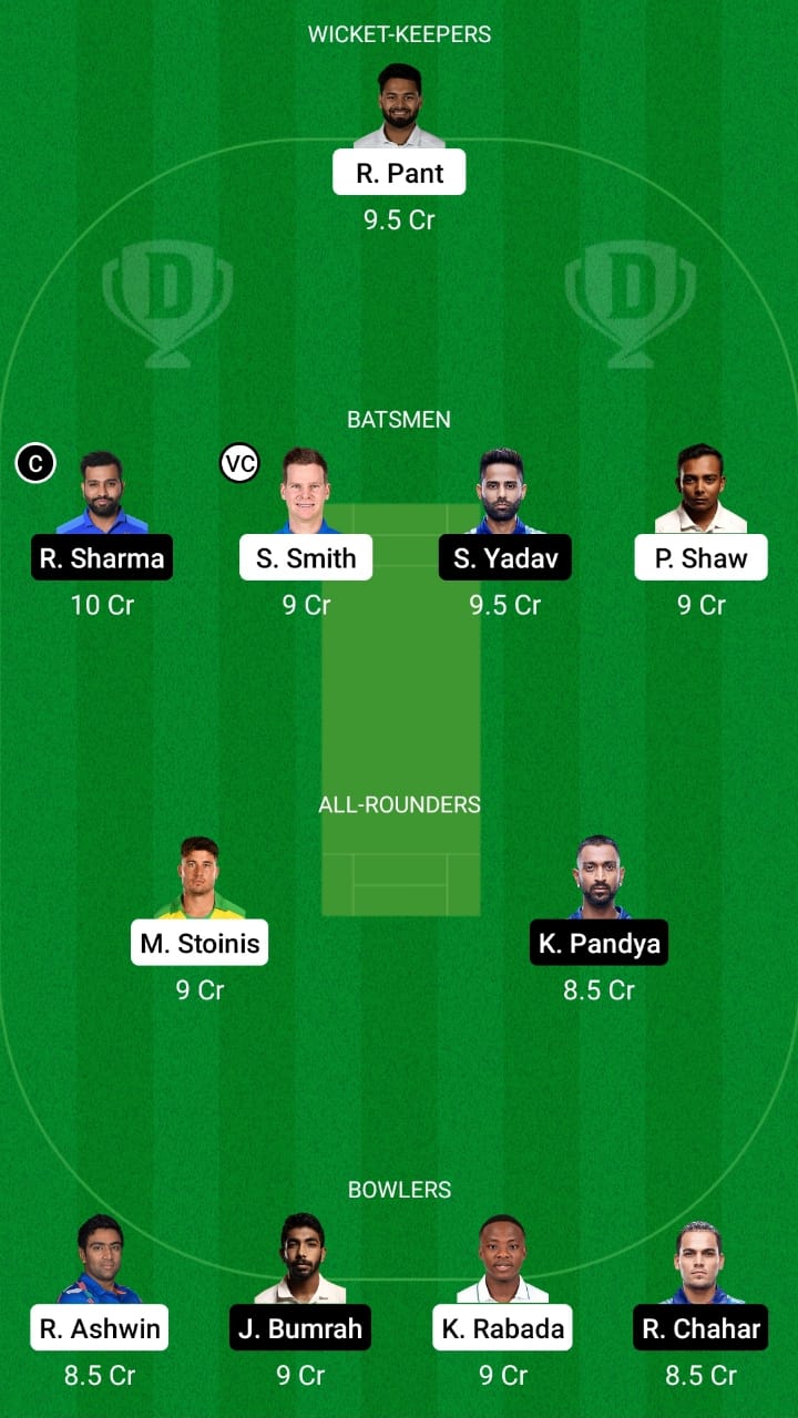 Rishabh Pant, Rohit Sharma (c), Suryakumar Yadav, Steve Smith (vc), Prithvi Shaw, Marcus Stoinis, Krunal Pandya, Ravi Ashwin, Jasprit Bumrah, Kagiso Rabada, and Rahul Chahar