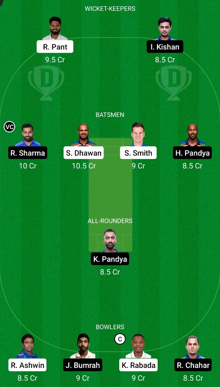 Rishabh Pant, Rohit Sharma (vc), Ishan Kishan, Steve Smith, Shikhar Dhawan, Hardik Pandya, Krunal Pandya, Ravi Ashwin, Jasprit Bumrah, Kagiso Rabada (c), and Rahul Chahar