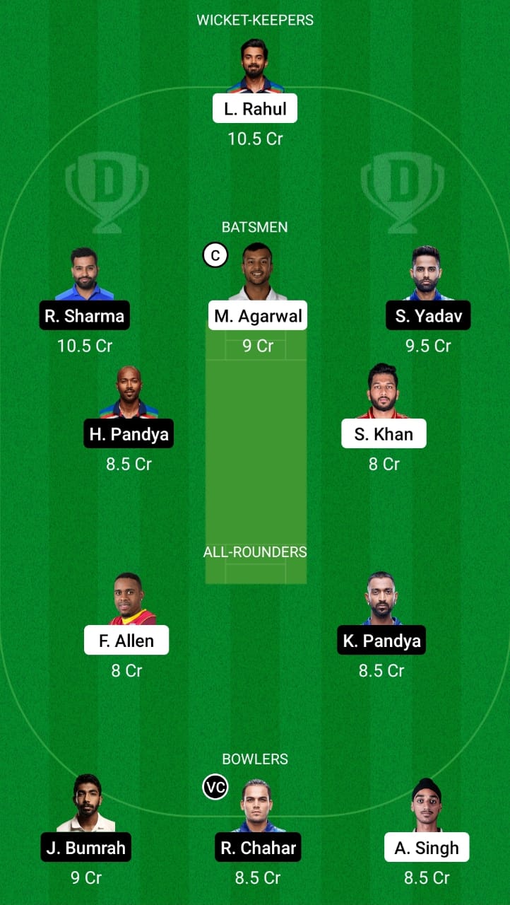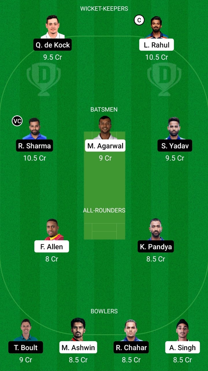 Quinton de Kock, KL Rahul (c), Suryakumar Yadav, Rohit Sharma (vc), Mayank Agarwal, Krunal Pandya, Fabian Allen, Trent Boult, Murugan Ashwin, Arshdeep Singh, Rahul Chahar