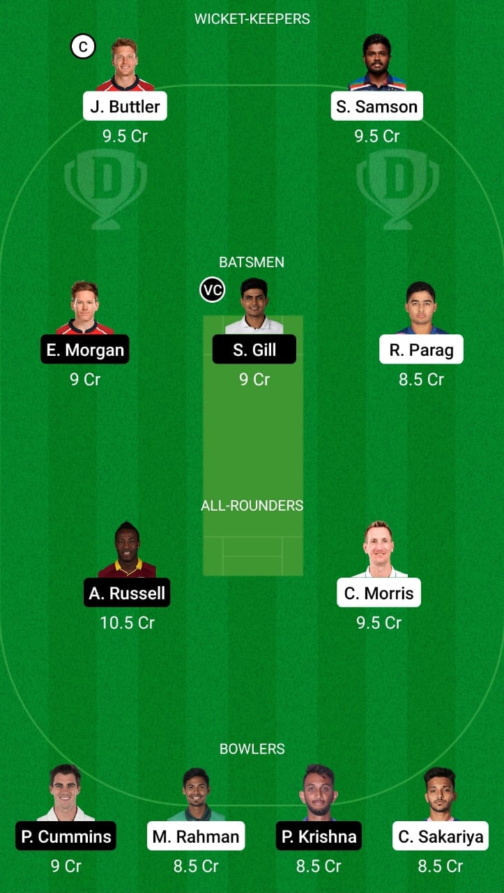 Sanju Samson, Jos Buttler (c), Riyan Parag, Shubman Gill (vc), Eoin Morgan, Andre Russell, Chris Morris, Pat Cummins, Chetan Sakariya, Prasidh Krishna, and Mustafizur Rahman