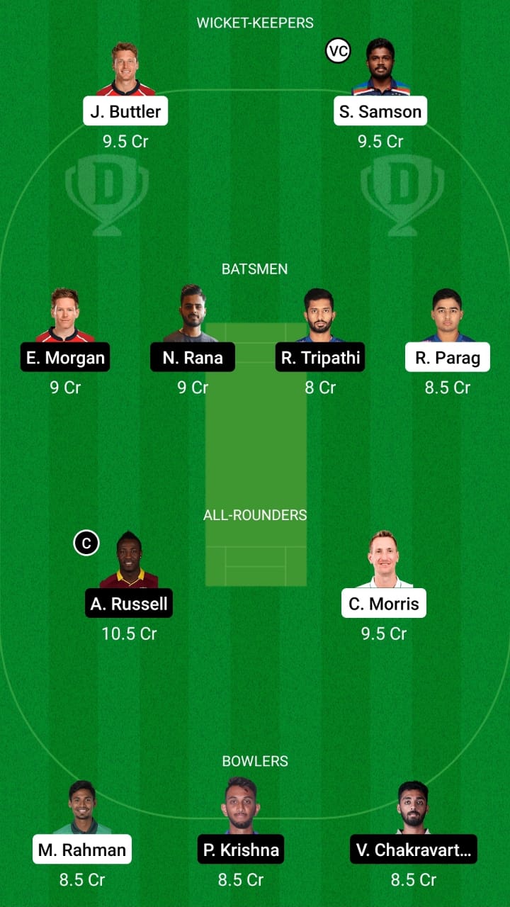 Sanju Samson (vc), Jos Buttler, Riyan Parag, Nitish Rana, Eoin Morgan, Andre Russell (c), Chris Morris, Varun Chakravarthy, Rahul Tripathi, Prasidh Krishna, and Mustafizur Rahman