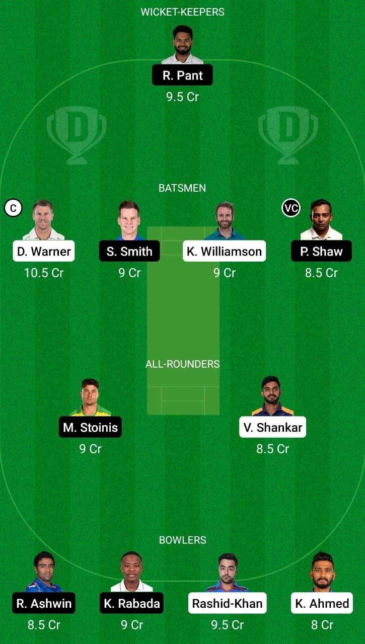 Rishabh Pant, David Warner (c), Kane Williamson, Steve Smith, Prithvi Shaw (vc), Marcus Stoinis, Vijay Shankar, Rashid Khan, Khaleel Ahmed, Kagiso Rabada, and Ravi Ashwin