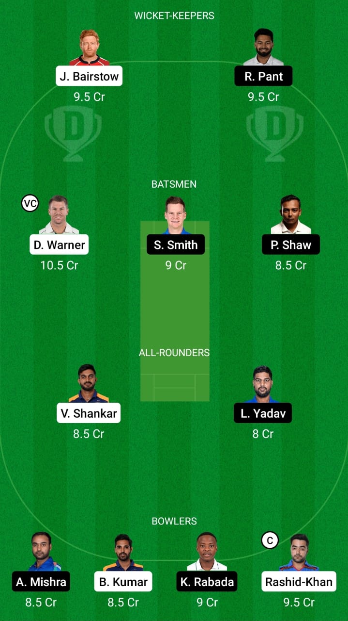 Rishabh Pant, Jonny Bairstow, David Warner (vc), Steve Smith, Prithvi Shaw, Lalit Yadav, Vijay Shankar, Rashid Khan (c), Bhuvneshwar Kumar, Kagiso Rabada, and Amit Mishra