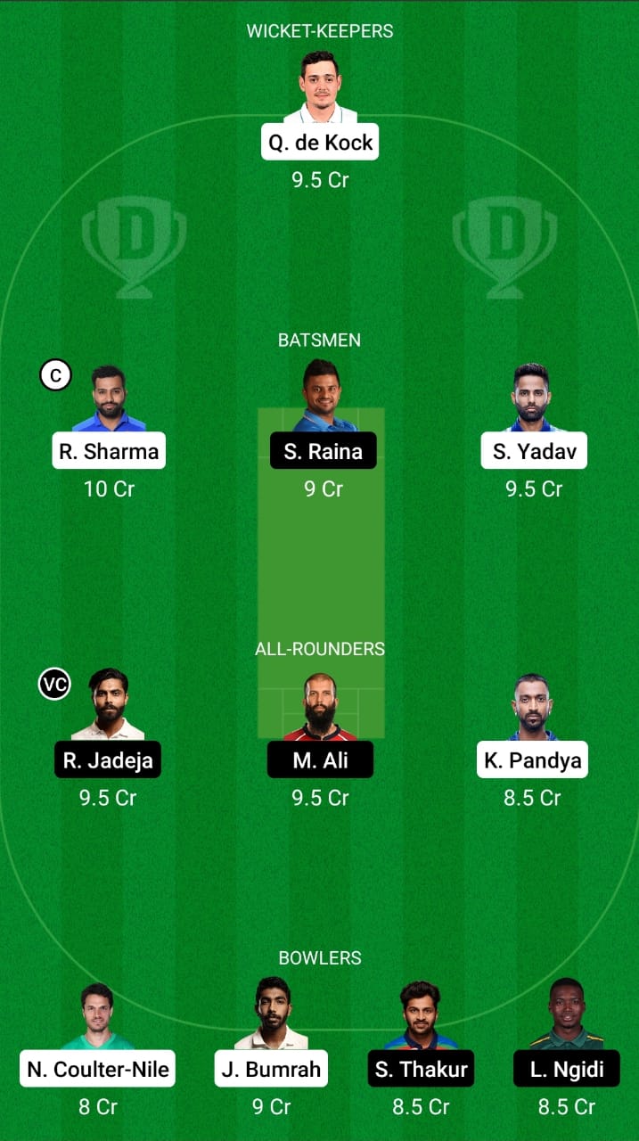 Quinton de Kock, Rohit Sharma, Suryakumar Yadav, Suresh Raina, Ravindra Jadeja, Moeen Ali, Krunal Pandya, Jasprit Bumrah, Lungi Ngidi, Shardul Thakur, and Nathan Coulter-Nile