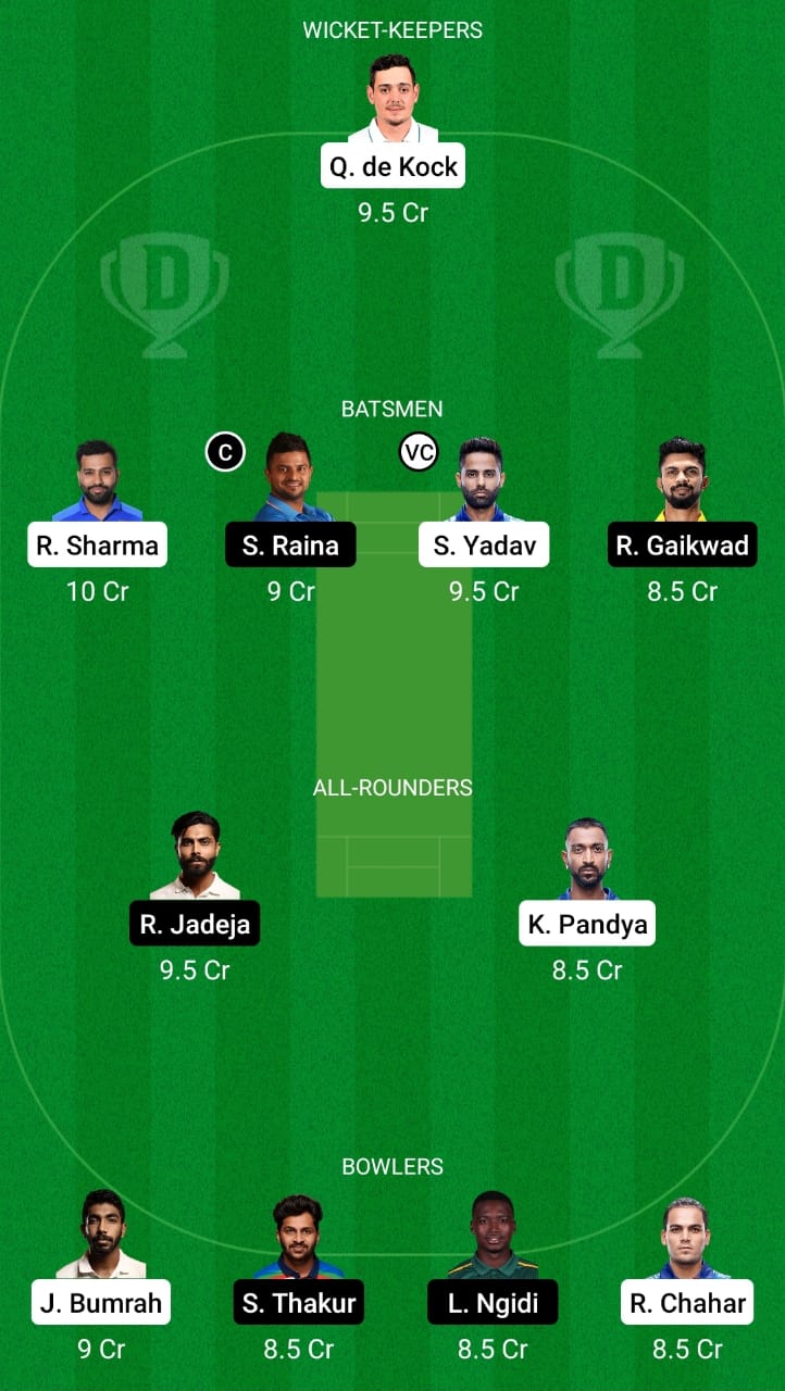 Quinton de Kock, Rohit Sharma, Suryakumar Yadav, Suresh Raina, Ravindra Jadeja, Ruturaj Gaikwad, Krunal Pandya, Jasprit Bumrah, Lungi Ngidi, Shardul Thakur and Rahul Chahar
