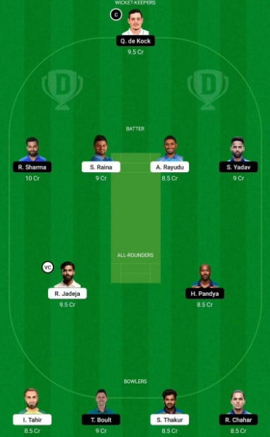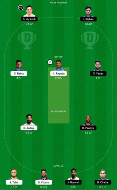 Quinton de Kock (vc), Ishan Kishan, Suresh Raina, Ambati Rayudu (c), Suryakumar Yadav, Ravindra Jadeja, Hardik Pandya, Imran Tahir, Rahul Chahar, Jasprit Bumrah, and Deepak Chahar