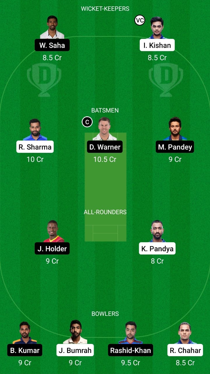Ishan Kishan (vc), Wriddhiman Saha, Rohit Sharma, Manish Pandey, David Warner (c), Krunal Pandya, Jason Holder, Rashid Khan, Rahul Chahar, Jasprit Bumrah, and Bhuvneshwar Kumar