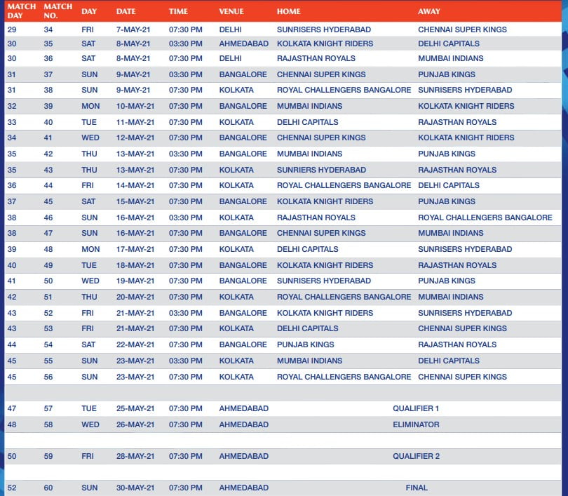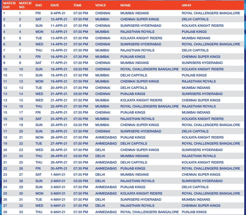 There will be a total of 11 double-headers in IPL 2021 where 6 teams will play three-afternoon games & two teams will play two-afternoon games. The afternoon matches have been scheduled to be commencing at 3:30 PM IST start while the evening games will have a 7:30 PM IST start as happened in the 13th edition as well.