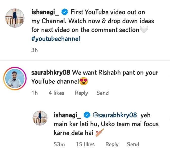 Without a surprise, the comment section was bombarded with cricket fans asking her about Rishabh Pant. One of the comments that caught everyone’s attention was from a user named saurabhkry08 that said, “We want Rishabh Pant on your YouTube channel.” In no time Isha Negi came up with an epic reply as she wrote,”@saurabhkry08 ye main kar leti hu, Usko team mai focus karne dete hai.”