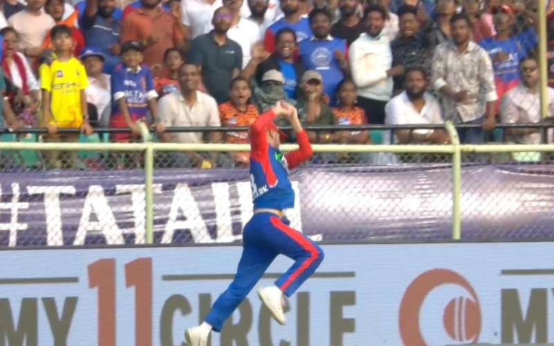 With both hands stretched out, he grabbed the ball mid-air before tumbling to the ground, ensuring he stayed inside the ropes. His athleticism not only removed a dangerous batter but also lifted the energy in the DC camp, proving why fielding brilliance can change the course of a game.