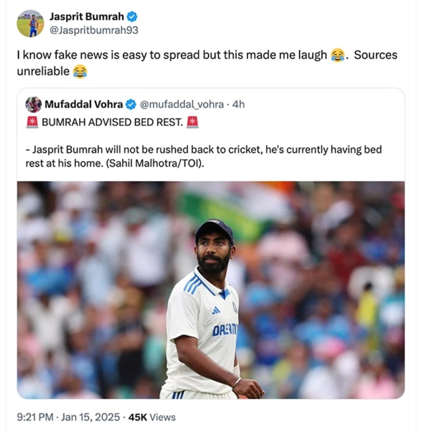 Indian pace sensation Jasprit Bumrah has dismissed recent reports suggesting he has been advised bed rest following a back injury sustained during the Border-Gavaskar Trophy. Taking to social media, Bumrah labelled the claims as “fake news” and found humour in the rumours. “I know fake news is easy to spread, but this made me laugh. Sources unreliable,” he posted on X (formerly Twitter), putting to rest concerns about his recovery and availability for upcoming tournaments.