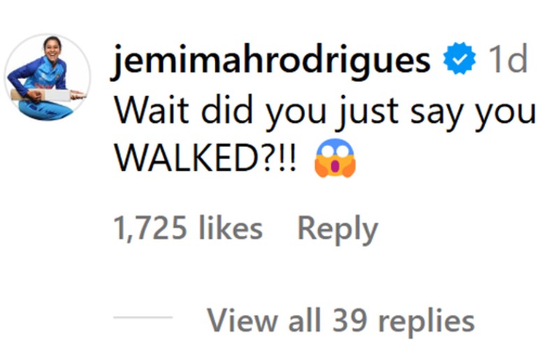 Her caption read, “What a trip this has been. From endless walking to meeting some amazing people. It has been a memorable one.” However, her teammate Jemimah Rodrigues couldn’t resist pulling her leg, humorously commenting, “Wait, did you just say you WALKED?!!”