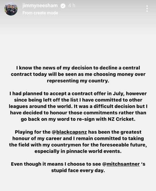 In his Instagram story, Jimmy Neesham said, “I know the news of my decision to decline a central contract today will be seen as me choosing money over representing my country. I had planned to accept a contract offer in July, however, since being left off the list I have committed to other leagues around the world. It was a difficult decision but I have decided to honor those commitments rather than go back on my word to re-sign with NZ Cricket.”